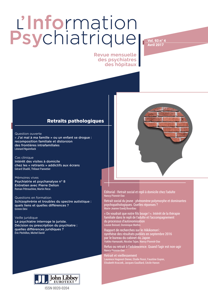 Au Japon, le phénomène de retrait social désigné par le mot hikikomori touche un nombre important d’individus, selon les enquêtes épidémiologiques. De plus, de nombreuses personnes qui ne sont pas dans cette situation disent « comprendre le sentiment d’être hikikomori ». Face aux enjeux que représente ce phénomène, le gouvernement japonais a ainsi rendu public les résultats d’une nouvelle enquête dont les auteurs présentent les principaux résultats. Il s’agit de données descriptives. Ce travail précis de traduction et de synthèse a pour objectif de rendre accessible à un plus grand nombre de chercheurs et de cliniciens ces données récentes concernant le Japon. Il permet de reposer les contours de la définition et des caractéristiques associées à cette conduite de retrait et de faciliter ainsi la poursuite des recherches et échanges internationaux sur ce phénomène qui n’épargnerait plus aucune société occidentalisée.